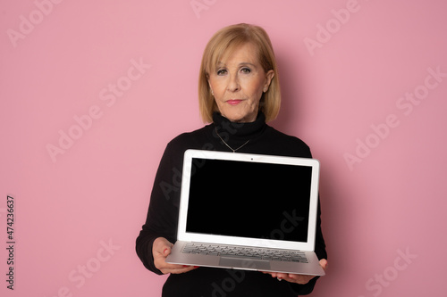 © Danko, Naklejka premium Senior woman showing laptop computer screen isolated over pink background.