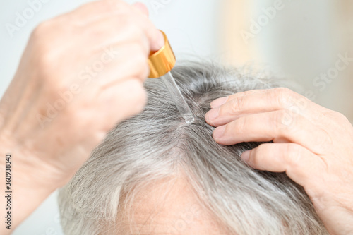 Obraz premium Senior woman using serum for hair loss treatment, closeup