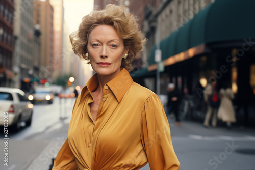 Fototapeta premium Senior woman walking down the street, elegant, AI generated