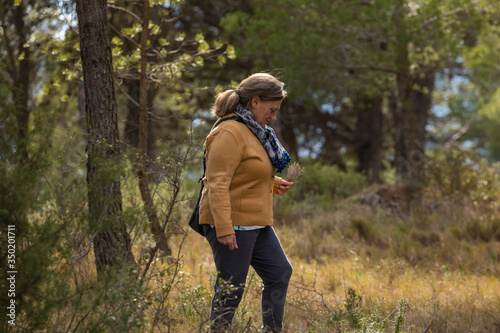 © Alvaro, Naklejka premium Senior woman walks looking for thyme and fragrant plants through the Santuario de Misericordia, near Borja, in the province of Zaragoza, Spain.