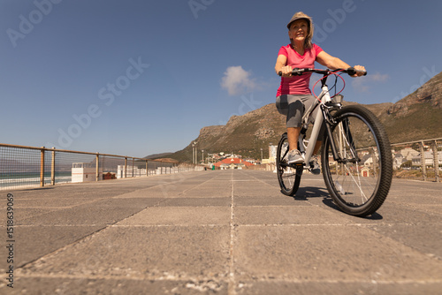 Obraz premium Senior woman wearing sunhat riding white mountain bike on coastal promenade...