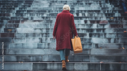 © Daniel, Fototapeta premium Senior woman with grocery bag walking on steps