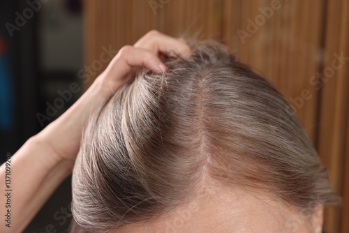 © New Africa, Naklejka premium Senior woman with healthy hair roots on blurred background, closeup