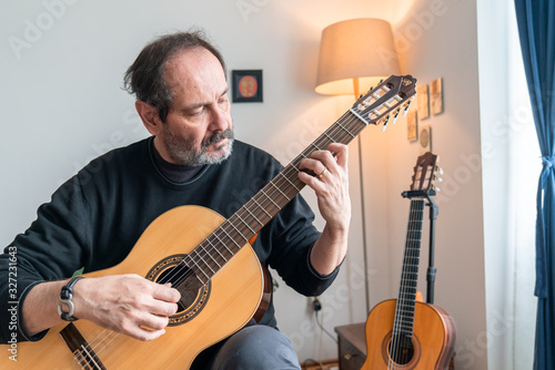 © shodography, Obraz premium Seniors man are playing a guitar at home. Retired man learning playing a guitar.