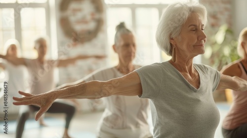 © spyrakot, Fototapeta premium Seniors Practicing Yoga for Joint Pain Relief in Bright, Airy Studio Setting