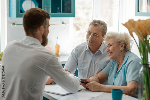© yuriygolub, Obraz premium Seniour couple meeting an advisor