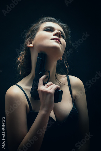 © tugolukof, Fototapeta premium sensual beautiful woman with gun on black background