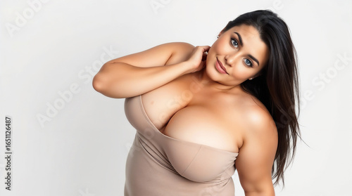 © shehroz khan, Fototapeta premium Sensual studio portrait of a plus-size brunette woman with her back to the camera, highlighting her glowing skin