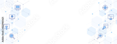 © Blockfine, Obraz premium Seo Banner Vector Illustration with Two-sided Icon Style. Line Duotone icon. Containing search, target, optimization, monitor, maintenance, insight, browser, programming