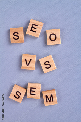 © DenisProduction.com, Obraz premium Seo vs sem concept. Letters written on wood block isolated on gray background. Web marketing symbols. Search engine optimization abbreviation.