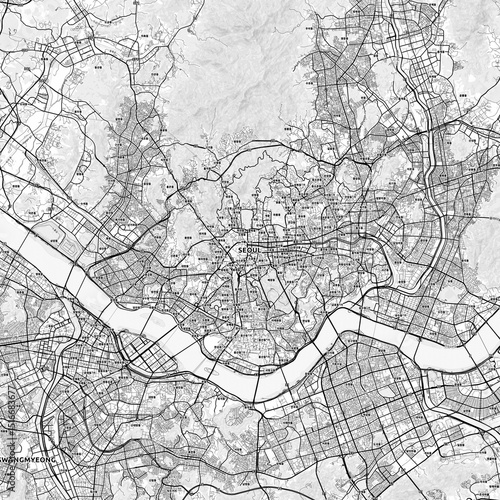 Naklejka premium Seoul Area Map with Labels and Neighborhoods - One color, minimalistic design