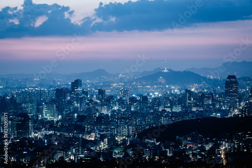 © panyaphotograph, Fototapeta premium Seoul City skyline and skyscrapers View of Seoul at night in Gangnam District area There is Namsan Mountain in the background, South Korea.