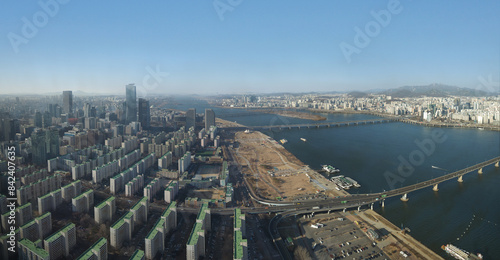 Obraz premium Seoul downtown aerial view with Han river, bridges and urban development residential area