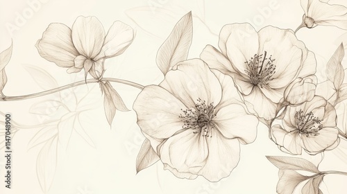 © jambulart, Fototapeta premium Sepia floral sketch, delicate lines, blossoms, branch.