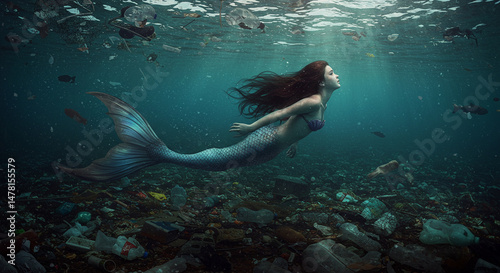 © Carina, Fototapeta premium Sereia nadando em águas de rio poluído