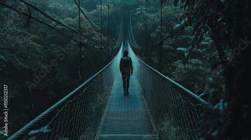 Obraz premium Serene Adventure on a Foggy Suspension Bridge in a Lush Rainforest Surrounded...