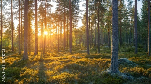 © CLOVER BACKGROUND, Fototapeta premium Serene Aerial View of a Finnish Forest During Sunrise
