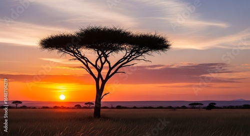 © Paino, Obraz premium Serene african sunset with a silhouette acacia tree offering a moment of peace
