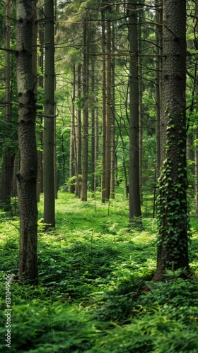 Fototapeta premium Serene Agroforestry Haven: Verdant Landscape with Towering Trees and Abundant Undergrowth in High Resolution Capture
