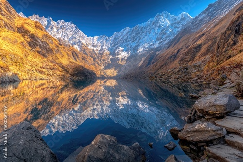 © Baber, Fototapeta premium Serene alpine lake reflecting snow-capped peaks