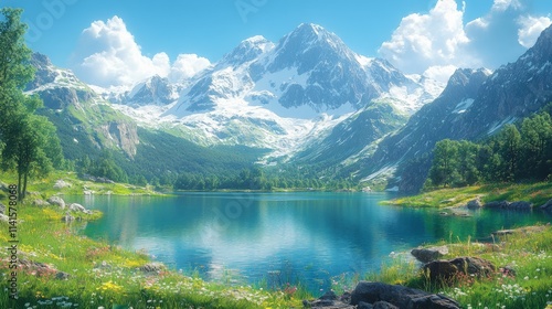 Fototapeta premium Serene alpine lake, snow-capped mountains, wildflowers.