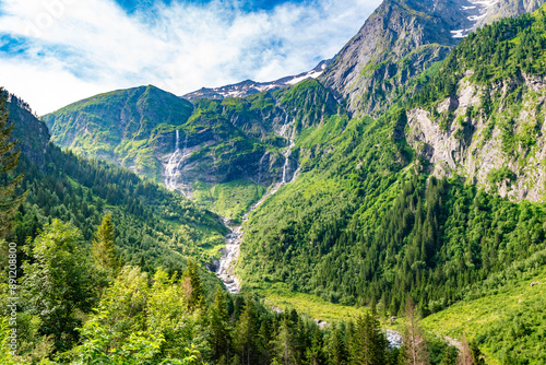 Naklejka premium Serene Alpine Landscape with Lush Vegetation and Zemmbach Waterfall