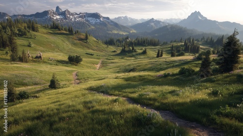 © 9DIGITECH, Fototapeta premium Serene Alpine Meadow with Scenic Views of Distant Mountains and Lush Greenery