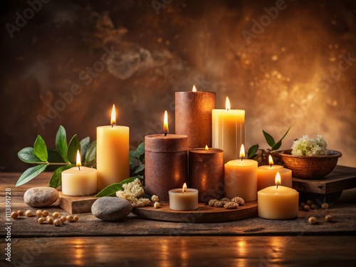 Obraz premium Serene Ambiance of Aromatic Candles in Low Light Setting with Copyspace for Relaxation and Meditation
