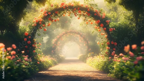 © Jittapon, Obraz premium Serene and enchanting garden archway surrounded by a lush display of blooming flowers basking in the gentle glow of the warm sunlight creating a picturesque and magical natural scene