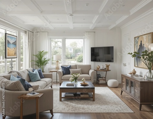 © Anum, Fototapeta premium Serene and inviting living room filled with natural light and tasteful decor