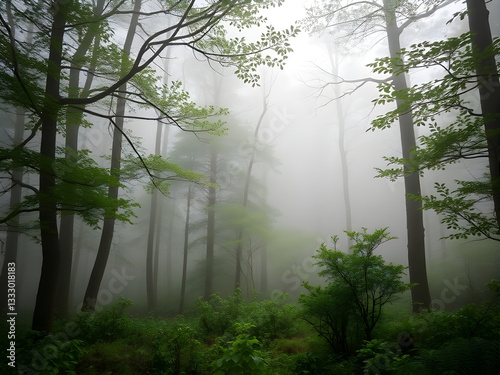 © Inas, Naklejka premium Serene and peaceful, a nature-inspired background with a misty forest
