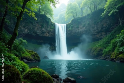 Fototapeta premium serene and peaceful waterfall in misty atmosphere, evergreen forest, peaceful...