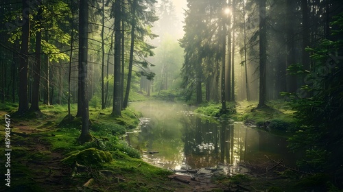 © manassawee, Obraz premium Serene and Tranquil Forest Landscape with Pond and Filtered Sunlight
