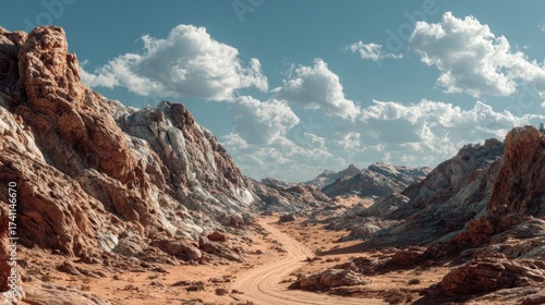 © Jauhari, Naklejka premium Serene arid canyon landscape with a path and dramatic cloudy sky view