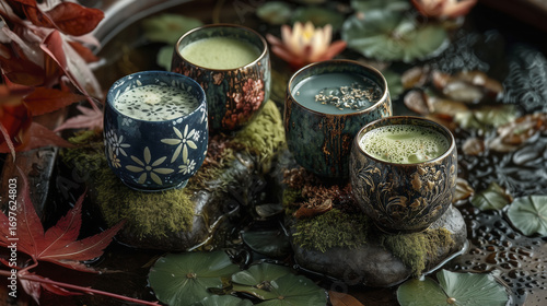 Fototapeta premium Serene arrangement of four beautifully crafted tea cups filled with vibrant green tea, resting moss covered stones amidst floating lotus flowers and lily pads. tranquil setting evokes sense