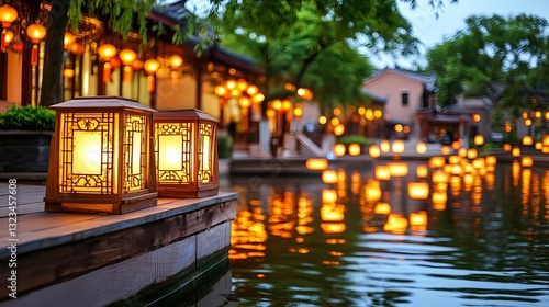 Fototapeta premium Serene Asian Garden at Dusk, Lanterns, Water - Zen/Mindfulness: The.