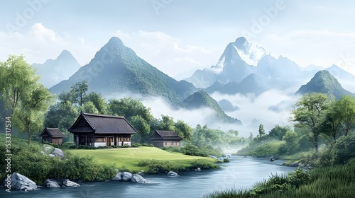 Fototapeta premium Serene Asian Landscape Misty Mountains River and Traditional Houses