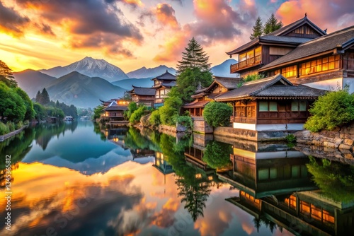 Naklejka premium Serene Asian Village Reflection at Sunset