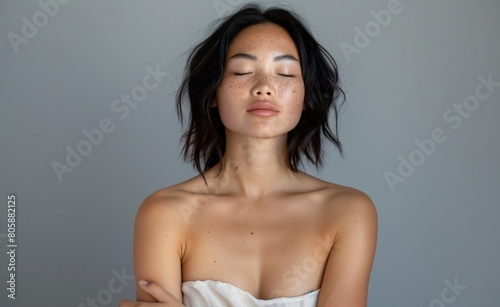 © Darya, Obraz premium Serene Asian Woman in White Strapless Top with Eyes Closed