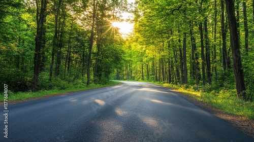 Obraz premium Serene Asphalt Road Surrounded by Lush Green Trees in a Sunlit Forest Pathway...