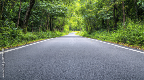 © Kittayawan, Obraz premium serene asphalt road winding through lush green trees and foliage