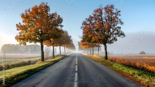 © Thares2020, Obraz premium Serene Autumn Countryside Road Lined with Vibrant Fall Foliage Towards Misty Horizon