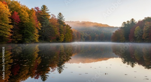 © Yunan, Fototapeta premium Serene Autumn Forest Landscape Reflection on Calm Lake in Morning Light