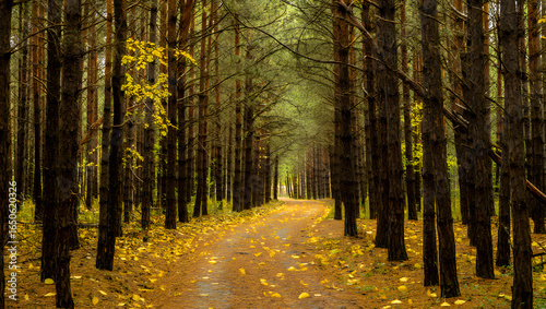 Obraz premium Serene Autumn Forest Path: Golden Leaves, Tall Pines, Tranquil Mood
