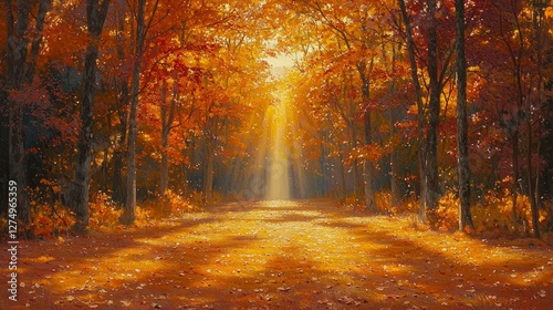 © Narongsag, Obraz premium Serene Autumn Forest Path Golden Sunlight Misty Woods Fall Foliage Nature Scene