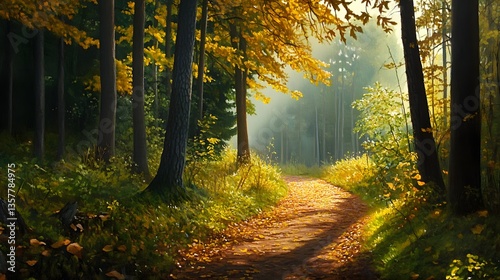 Naklejka premium Serene Autumn Forest Path Sunlight Through Trees Fall Foliage Scenery