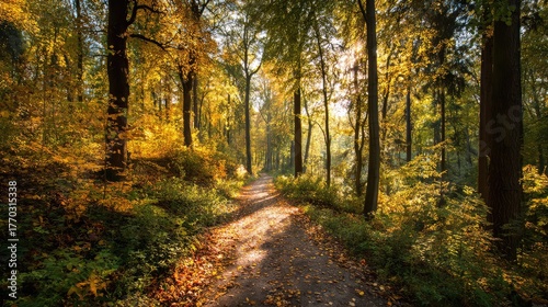 Obraz premium Serene Autumn Forest Pathway Illuminated by Sunlight Through Colorful Trees...