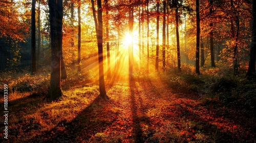Fototapeta premium Serene Autumn Forest Scene with Sunlight Filtering Through Trees