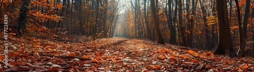 Obraz premium Serene autumn forest with a path covered in vibrant fall leaves, sunlight...