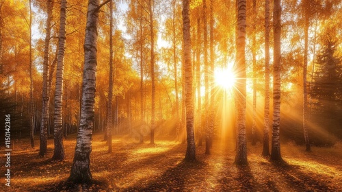 Fototapeta premium Serene Autumn Forest with Sunlight Beaming Through Golden Leaves